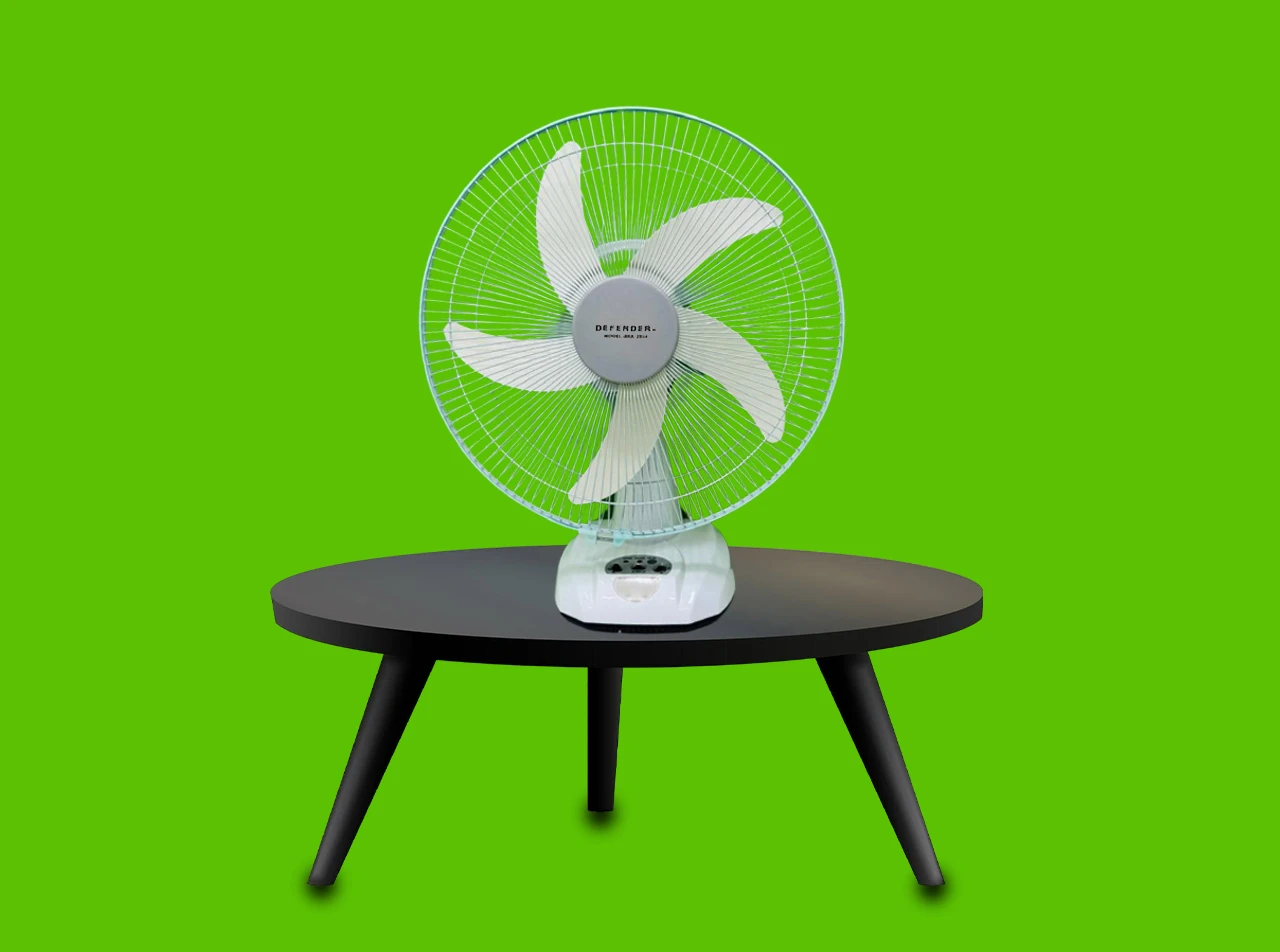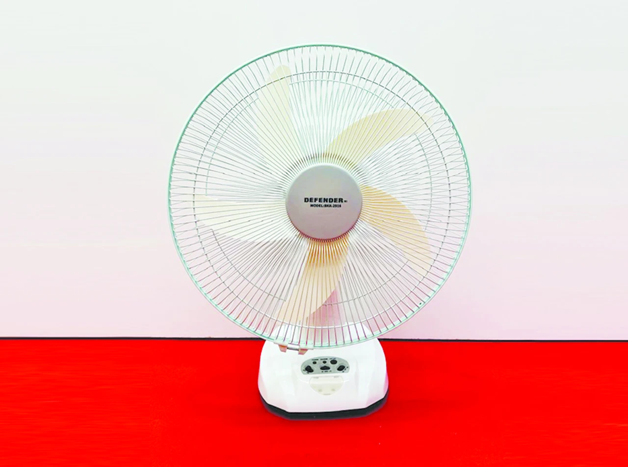 Buy Defender BKK-2916 Rechargeable Table Fan in Bangladesh. 3-speed settings, 6V–7Ah battery, up to 12 hours backup, LED light, overcharge protection, and free home delivery in Dhaka.